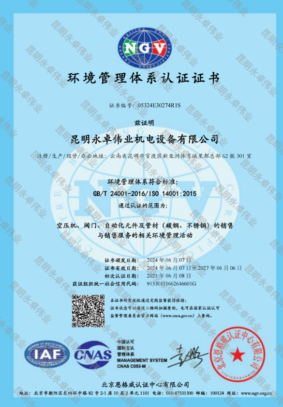 環(huán)境管理體系認證證書